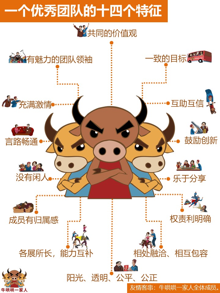 作品说明:以三头小牛(牛哄哄一家人logo)为核心创意,通过三头小牛紧密团结、英姿勃发的姿态,揭示出一个优秀团队的14个特征,引发众多职场人士、团队成员的共鸣,并成为团队奋斗参照。