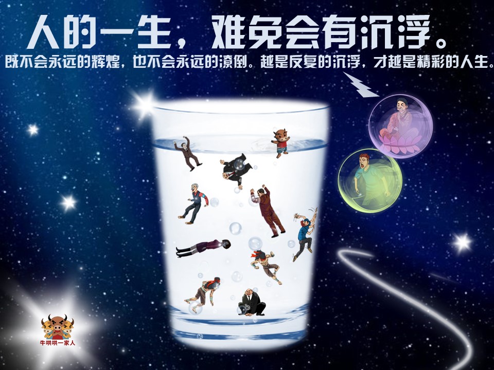 作品说明:牛牛佛带着梅头脑跳出三界外,看众人在杯中起起落落的人生,从而告诫大家得意时不要自满,失意时也不要灰心,因为人生充满了变数,一切都要靠自己。