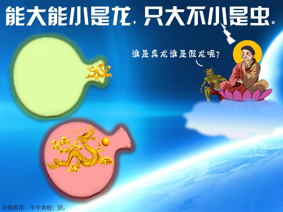 作品说明:以假龙不知变小无法从瓶中逃脱,真龙知道变小从瓶子中逃出为创意,提醒人们一定要能大能小,懂得低头,学会隐忍,这样才能有所成就。